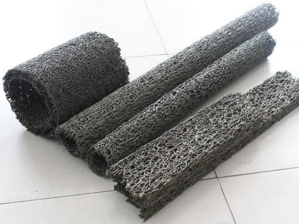 塑料盲溝是由塑料芯體外包裹濾布組式。塑料芯體是以熱可塑性合成樹(shù)脂為主要原料,經(jīng)過(guò)改性,在熱熔狀態(tài)下,通過(guò)噴咀擠壓出細(xì)的塑料絲條,再通過(guò)成型裝置將擠出的塑料絲在結(jié)點(diǎn)上熔接,形成三維立體網(wǎng)狀結(jié)構(gòu)。