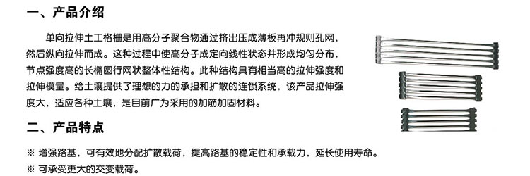 單向拉伸的土工格柵是由高分子聚合物經擠出壓成薄板再沖規(guī)則孔網,然后縱向拉伸而成。這種過程中使高分子成定向線性狀態(tài)并形成分布均勻、節(jié)點強度高的長 橢圓形網狀整體性結構。此種結構具有相當高的拉伸強度和拉伸模量,特別是我公司此類產品更具有超國際水平的高早期(伸長率在2%—5%)拉伸強度和拉伸模 量。給土壤提供了理想的力的承擔和擴散的連鎖系統。該產品拉伸強度大(>150Mpa),適應各種土壤,是目前廣為采用的加筋加固材料。
